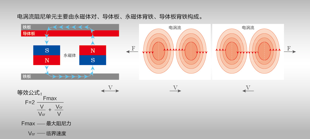基本原理:當(dāng)導(dǎo)體板(銅板或鋁板)在兩塊永磁體之間的空氣間隙中沿垂直磁感應(yīng)強(qiáng)度方向運(yùn)動(dòng)時(shí),導(dǎo)體板中產(chǎn)生電渦流。渦流場與磁場相互作用,產(chǎn)生的洛倫茲力將阻礙導(dǎo)體板和磁場之間的相對(duì)運(yùn)動(dòng)(楞次定理),同時(shí)電渦流因?qū)w板中的電阻作用而轉(zhuǎn)化為熱能耗散掉,產(chǎn)生阻尼效應(yīng)。當(dāng)導(dǎo)體板或永磁體與振動(dòng)結(jié)構(gòu)連接時(shí),導(dǎo)體板上不斷地有電渦流產(chǎn)生,同時(shí)結(jié)構(gòu)的動(dòng)能不斷地轉(zhuǎn)化為導(dǎo)體板中的熱能,使結(jié)構(gòu)振動(dòng)逐漸衰減。